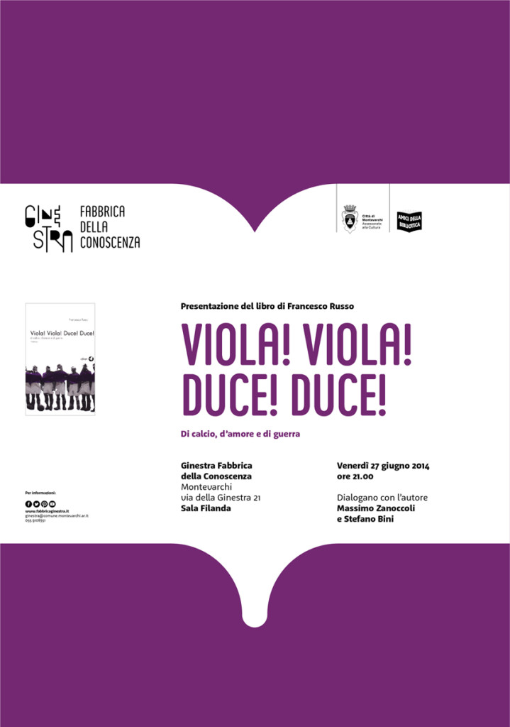 Questa sera alla Ginestra Fabbrica della Conoscenza di Montevarchi verrà presentato il libro di Francesco Russo “Viola! Viola! Duce! Duce! di calcio, d’amore e di guerra”. L’appuntamento è fissato alle 21:00