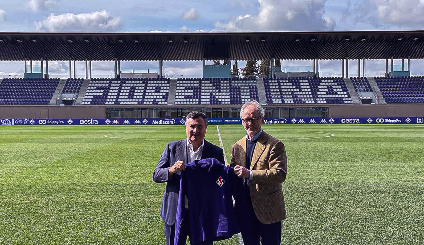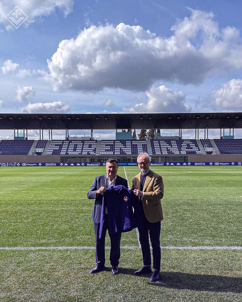 Nella foto dal sito ufficiale viola, un momento con il passaggio dalle mani del figlio nell’iconico spazio dello stadio “Curva Fiesole”.